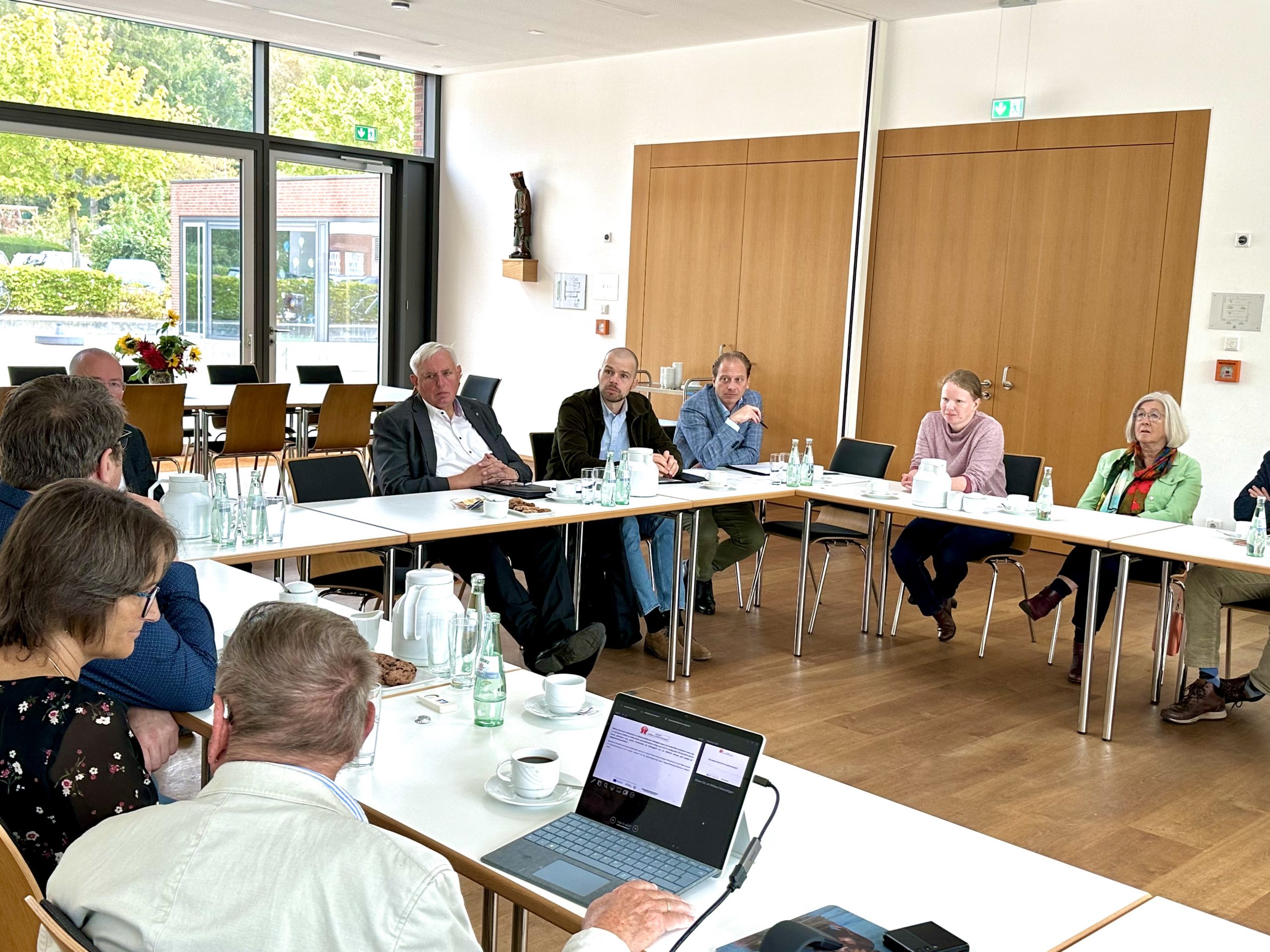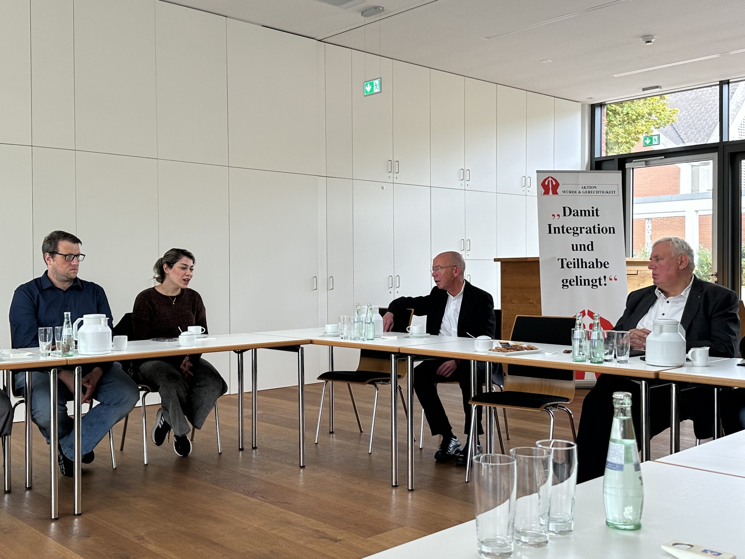 Mit finanzieller Unterstützung des Landes Nordrhein-Westfalen und der Europäischen Union verfügt die Aktion Würde & Gerechtigkeit über ein Angebot namens “Arbeitsmigrant*innen stark machen — Rechtsberatung mit hauptamtlicher juristischer Kompetenz. Grund genug für den Landesarbeitsminister Karl-Josef Laumann, sich mit Vereinsmitgliedern und weiteren Aktiven zu treffen — zumal er selbst Vereinsmitglied ist. Die juristische Beratung des Vereins, namentlich Klaus Körner und Antonia Lammert, stellten den Verein und ihre Beratungstätigkeit dar. Es folgte ein offener Austausch über die Dinge, die bereits erreicht wurden und die Dinge, die noch erreicht werden müssen. Einig waren sich die Beteiligten darin, dass die Integration von Arbeitsmigrantinnen und Arbeitsmigranten von wichtiger Bedeutung ist, die deutsche Bürokratie — Stichwort Anerkennung ausländischer Berufsabschlüsse — für die Integration aber oft hinderlich ist.